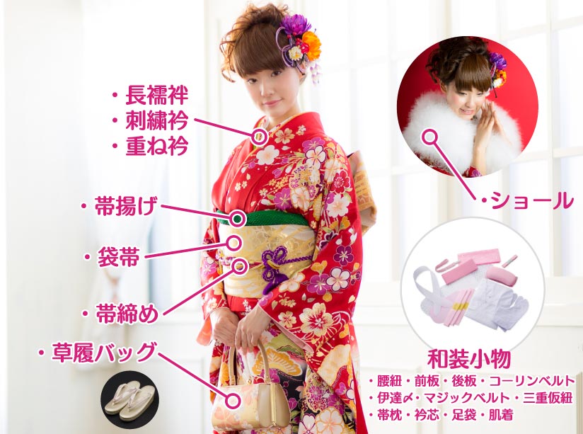 気軽に振袖をきて成人式に出席されたいという方に最適なプランです。 振袖、長襦袢、袋帯はもちろんの事、着付け小物まで全て揃ったフルセットです。 着用後のお手入れも不要で安心です。
