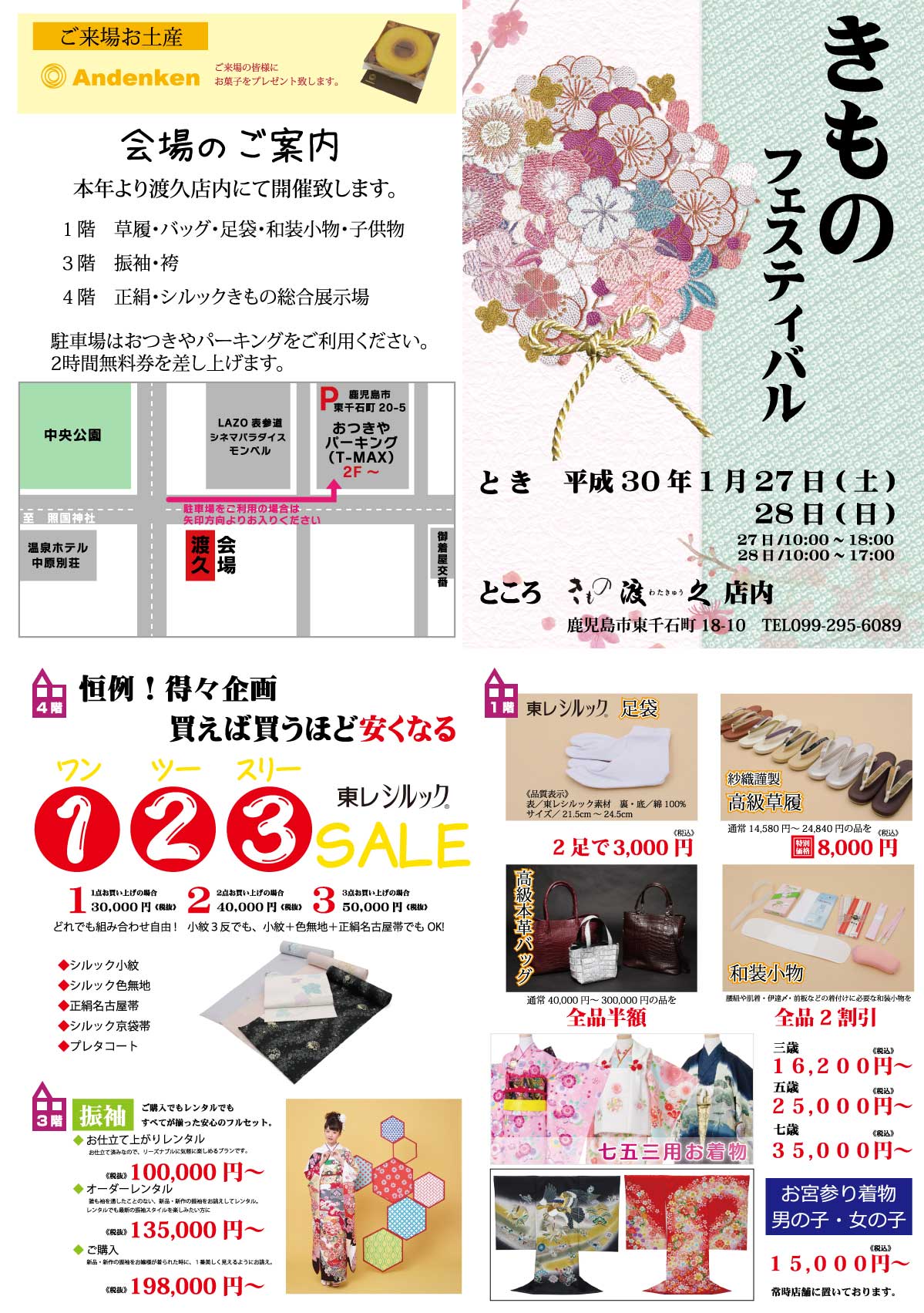 1月27日(土)28日(日)に創業祭を開催いたします。 例年は別会場をかりての展示会でしたが、 今年から自社ビルの1階・3階・4階を利用しての初の試みです。 天文館に移転してから会社で創業祭をすることを目標にしていましたが、 3年目で実現いたしました。 普段見れない商品から、普段ではとてもお出しできない格安の商品など、 京都より沢山の商品が届きます。 もちろん案内状をお持ちでない方でもご来場いただけますので、 お気軽に足をお運びください。