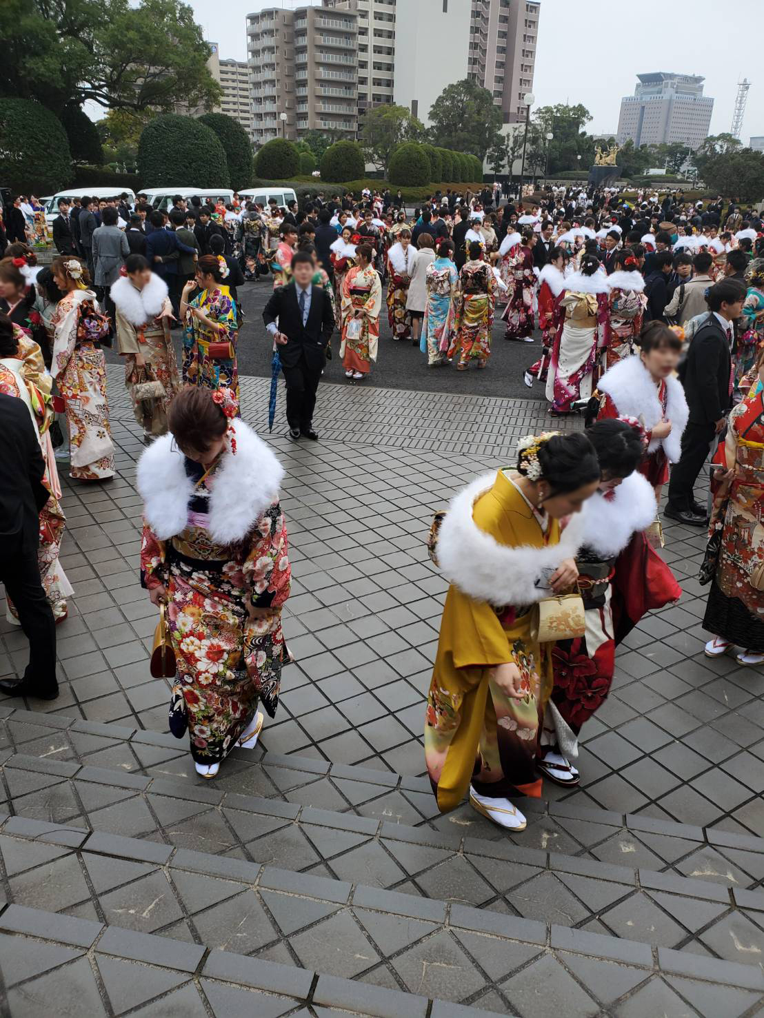 明日が成人の日でございますが、本日、鹿児島市の成人式がおこなわれました。 ご成人の皆様おめでとうございます。 当初雨予報だったお天気も曇りとなり、一安心。 渡久でも早朝から美容室様と連携をとり、ヘアメイク・お着付け また、前撮りが出来なかったお客様の写真撮影もさせていただきました。 着付けの後は成人式会場の市民文化ホールに移動して着付け直しのボランティアを致しました。
