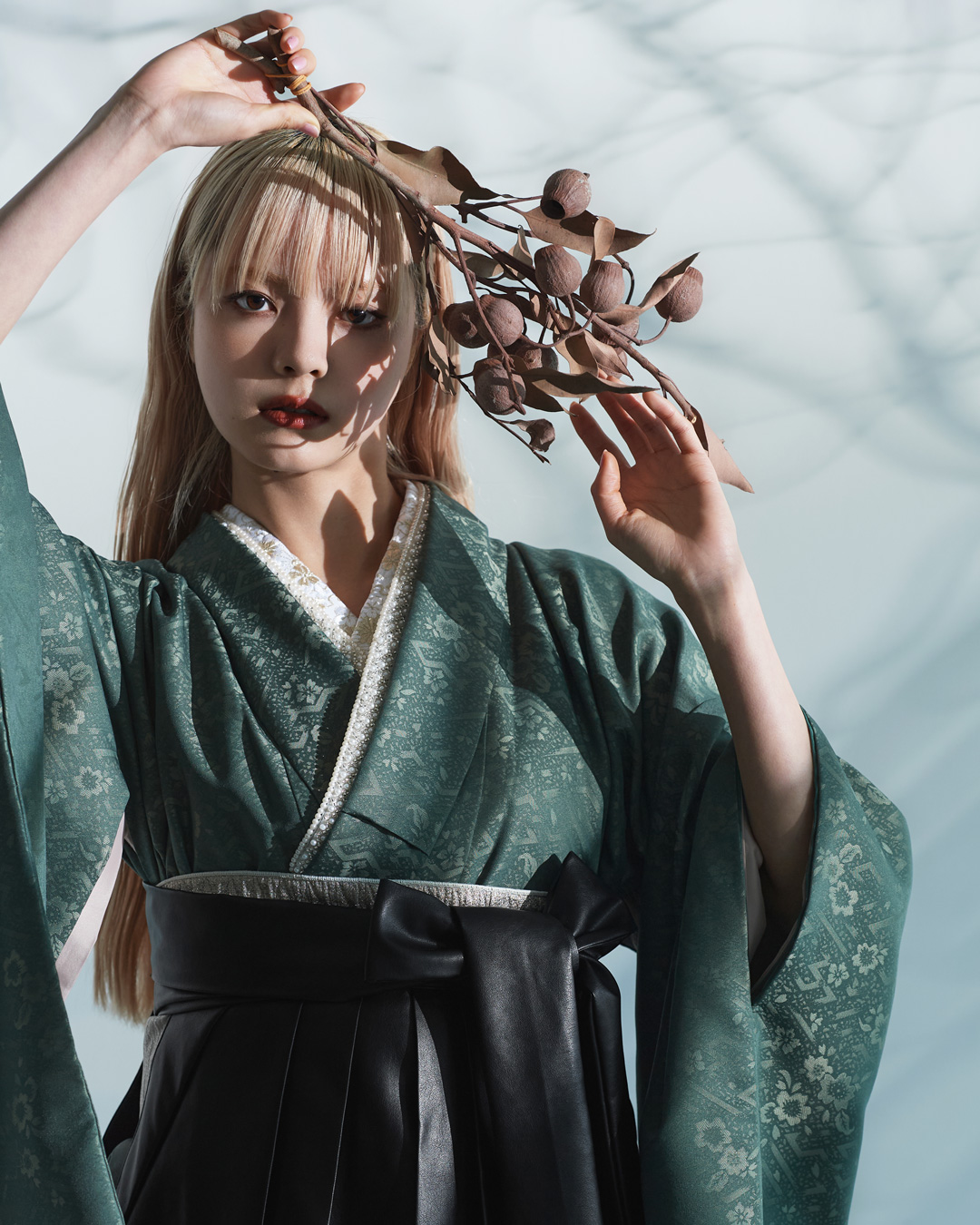 地模様入りのグリーンの二尺袖に、レザー調の黒の袴