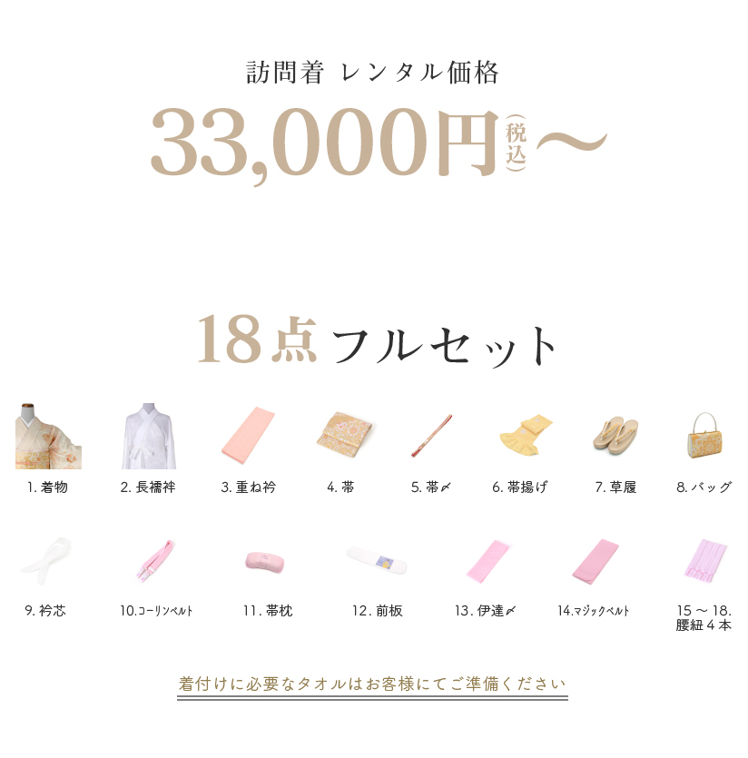 当店では訪問着のレンタルも行っております。結婚式や七五三、入学式などに着ていただける訪問着と帯、着付けに必要な小物もすべてセットになった18点フルセットレンタルです。